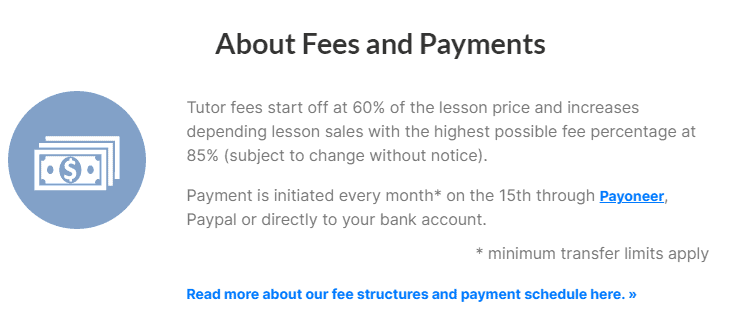 The bottom line pay-wise is that teachers earn between 60-85% of the total charged to the student, which varies generally between $14-$36/hour.