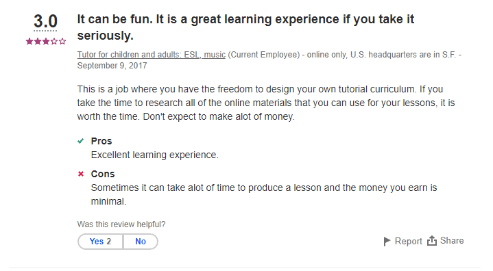 Generally, the reviewers cite the flexible scheduling and friendly, professional working environment. Drawbacks include taking time to build up your profile as an independent contractor and criticisms of the lower pay scale compared to some other online ESL platforms.