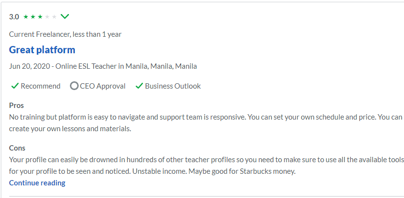 Cafetalk is still a relative newcomer to the ESL field, so it is not as thoroughly vetted on independent sites as other well-known platforms. However, it does have a 3.7/5-star rating on Indeed.com.