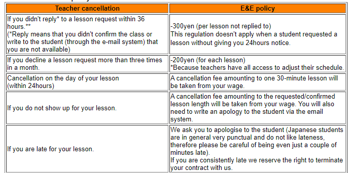 Below is an outline of the company’s policies for tardiness, absenteeism, etc. As you can see, the penalties can get fairly steep for non-responsiveness, failing to reply to a lesson request, or not showing up to classes.