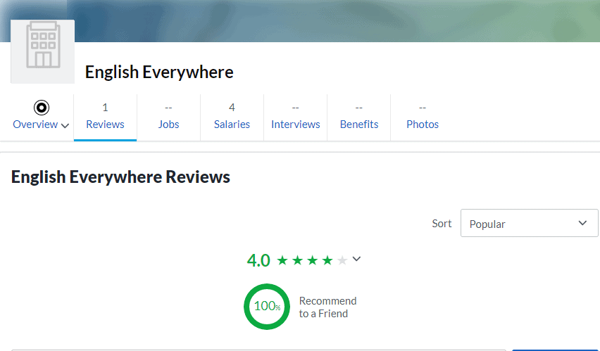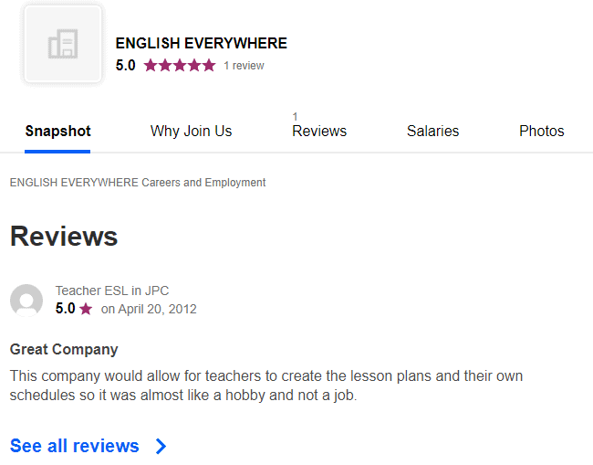 EnglishEverywhere has a grand total o one (1) review on Glassdoor. However, the reviewer left a generous 4/5-star rating.