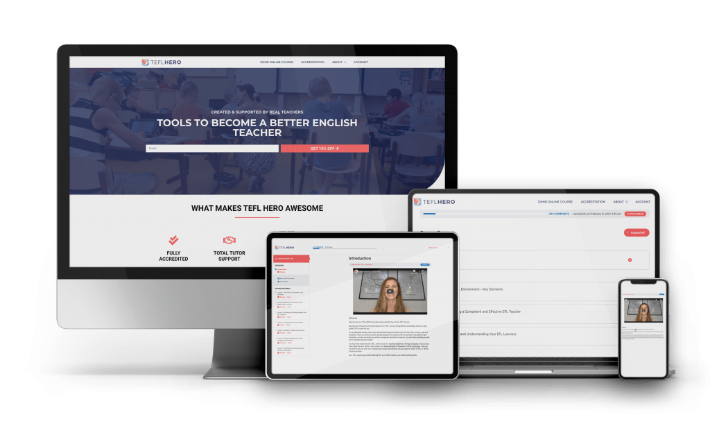 Founded by a group of ESL teachers, TEFL Hero was created to provide accessible, affordable, high-quality TEFL training in an all-online, intuitive format. Drawing on their own experiences with input from experts, the TEFL Hero team built the ESL training program to help teachers learn the fundamentals necessary to succeed in person and online.