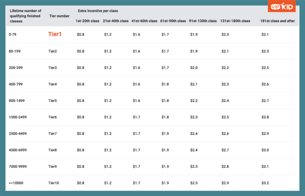 However, teachers receive a de facto raise under the progressive incentive pay structure in accordance with how many total classes they have successfully completed in their career with VIPKid (please see the pay tier chart in an earlier section for reference).